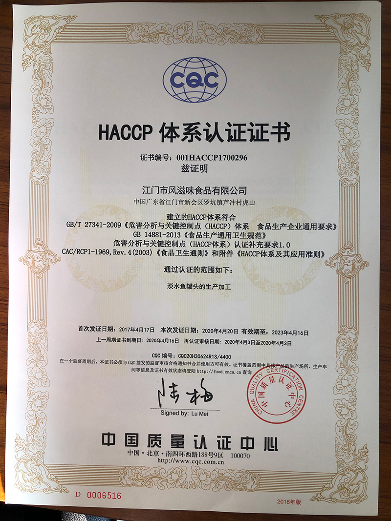 HACCP體系認(rèn)證證書